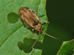 Viburnum leaf beetle is greyish-brown. The yellow and black larvae eat holes in viburnum leaves, leaving only the large veins behind. To check for an infestation, check stems of plants. Rows of bumps mean there are eggs buried in the stem.